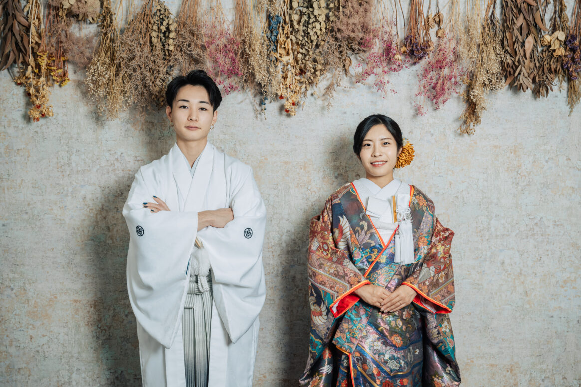 白の紋付袴は結婚式の前撮りやフォトウエディング、披露宴などで人気の色になります。