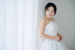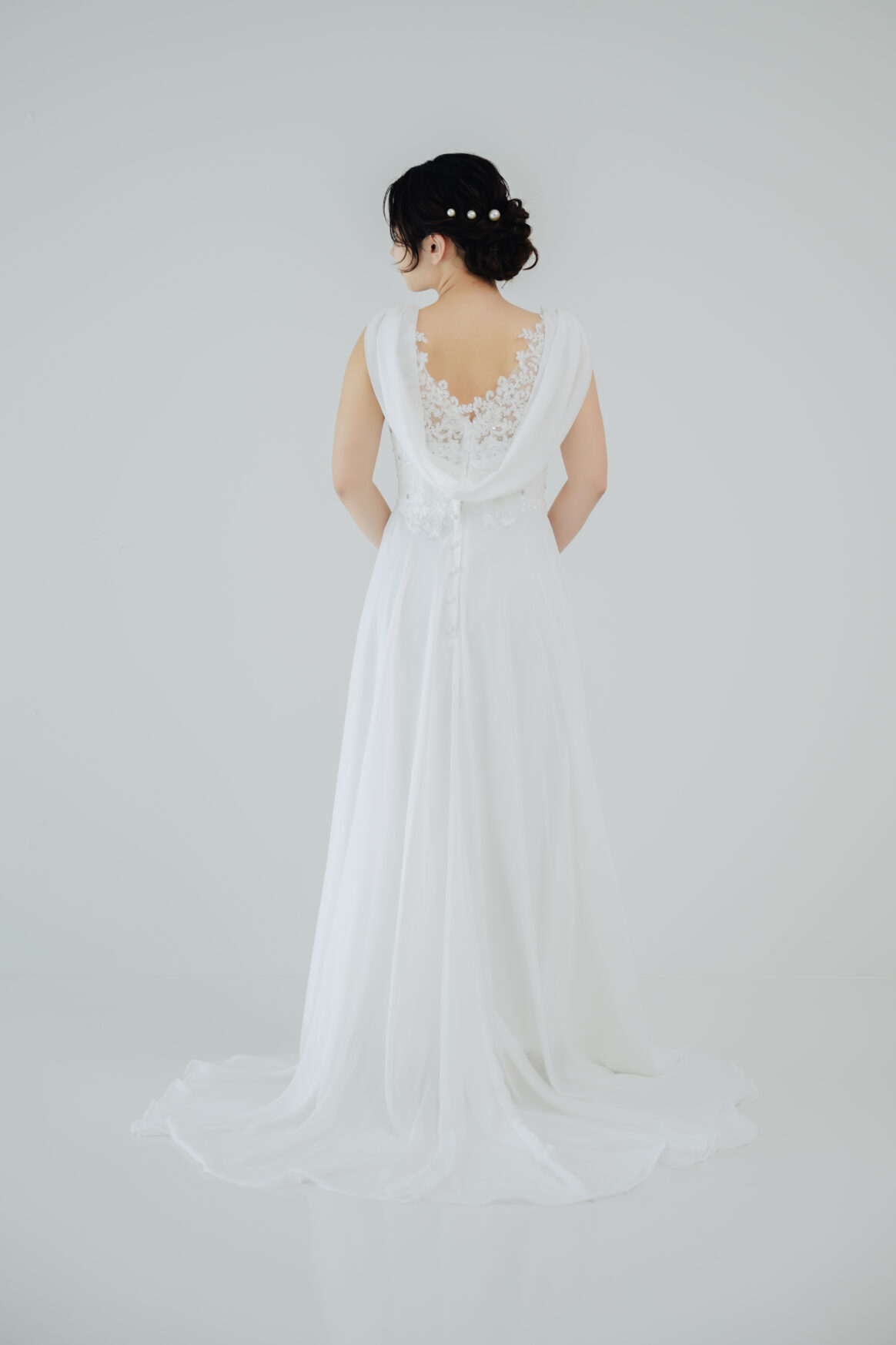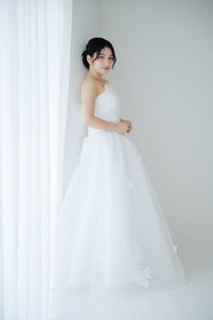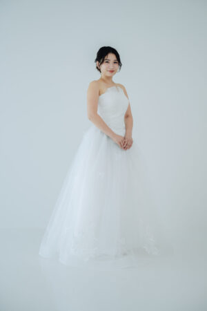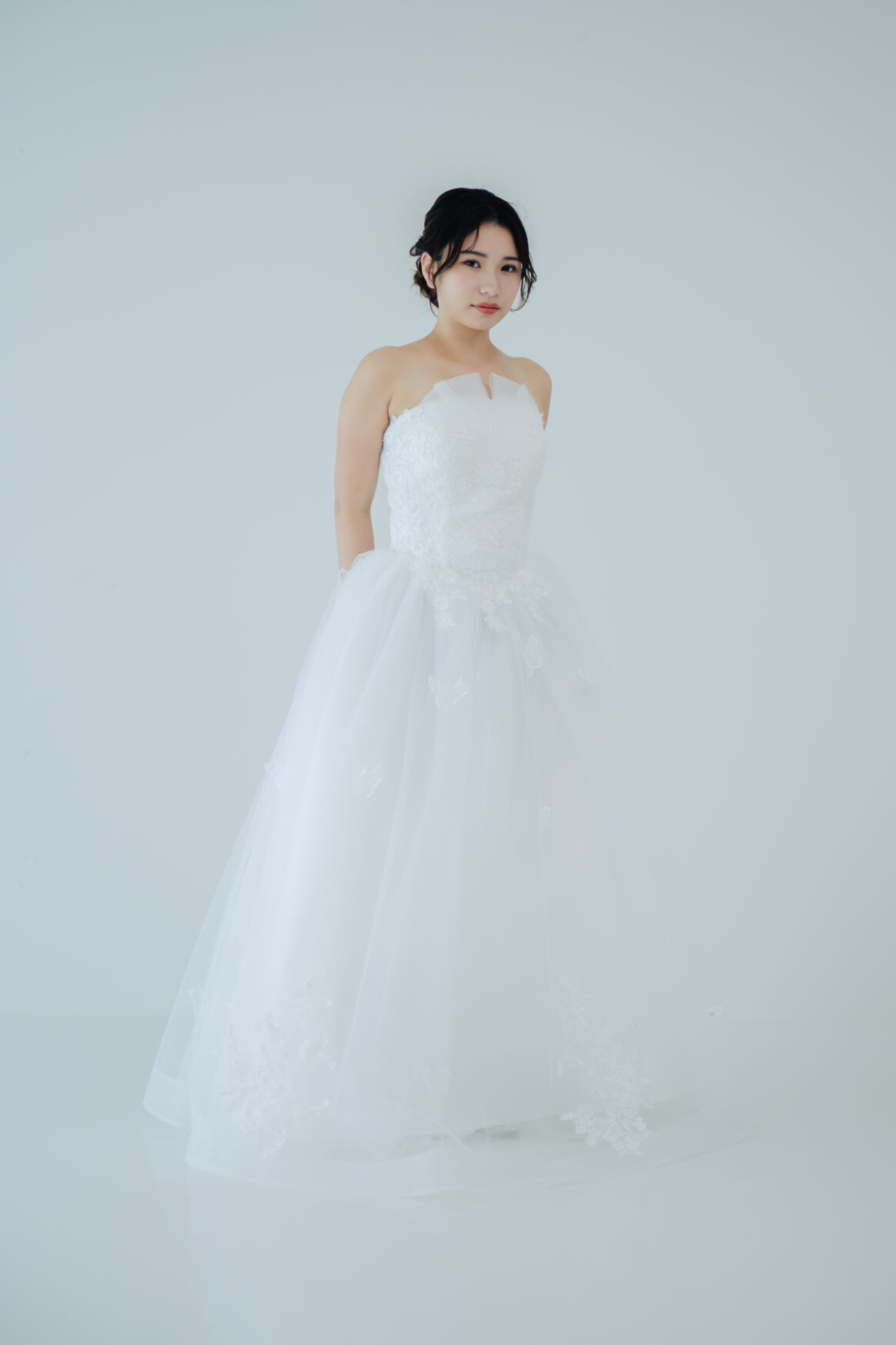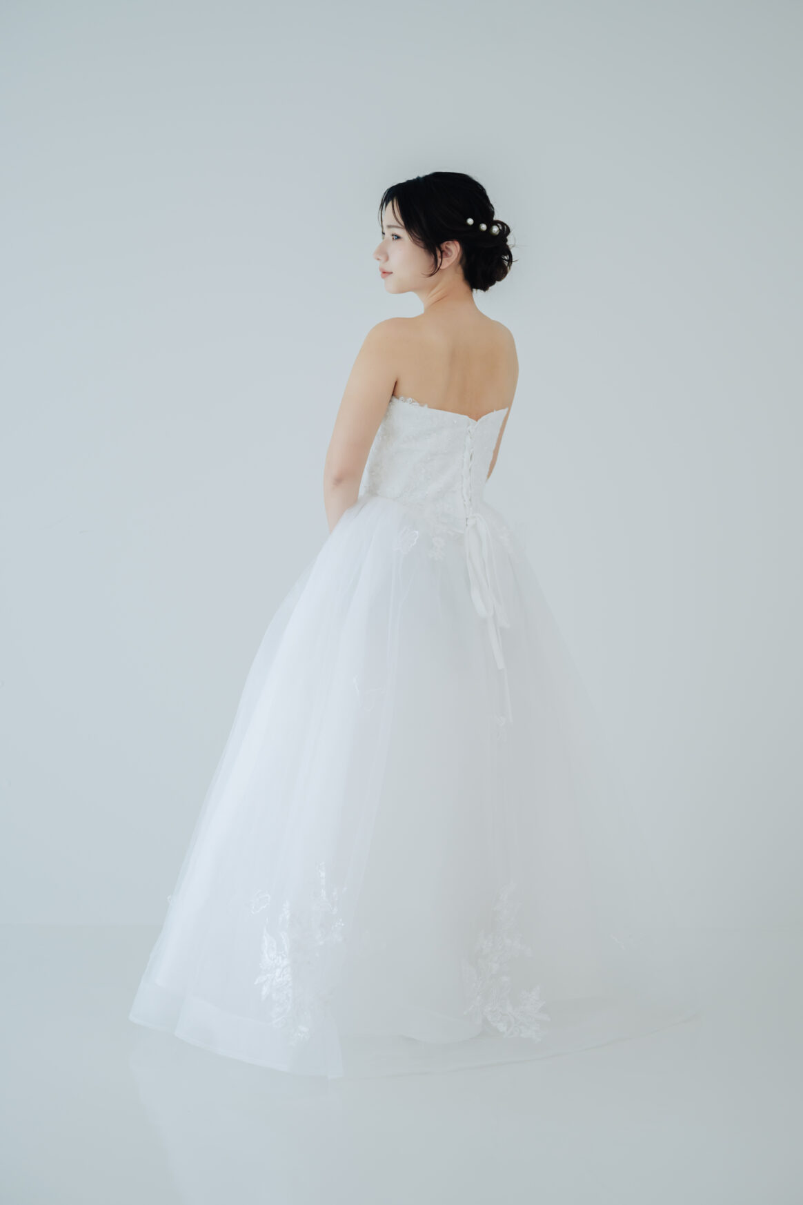 蝶々のモチーフがついた王道プリンセスラインのウェディングドレス。裾はホースヘアで仕上げ波打つトレーンがチャペルに似合います。