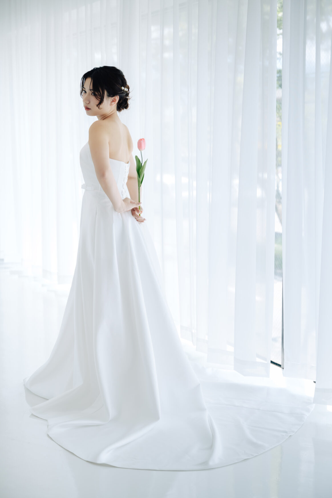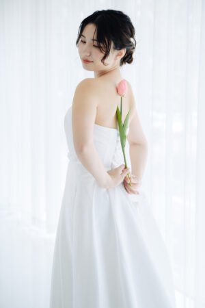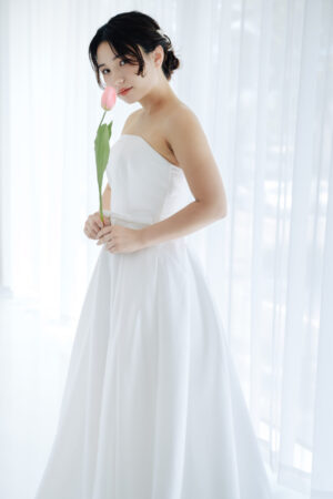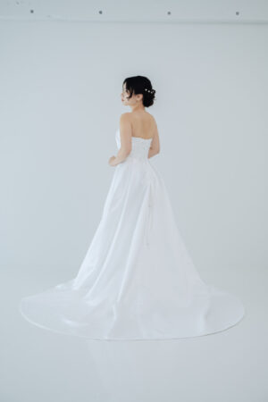 ウエストにそっとあしらわれた細リボンが女性らしさを引き立て、 歩くたびに揺れる柔らかな生地が、 花嫁を優しく包み込みます。