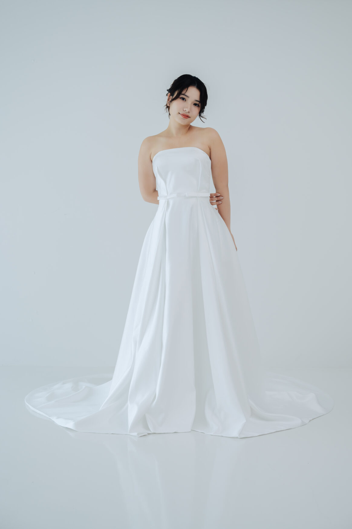 ウエストにそっとあしらわれた細リボンが女性らしさを引き立て、 歩くたびに揺れる柔らかな生地が、 花嫁を優しく包み込みます。