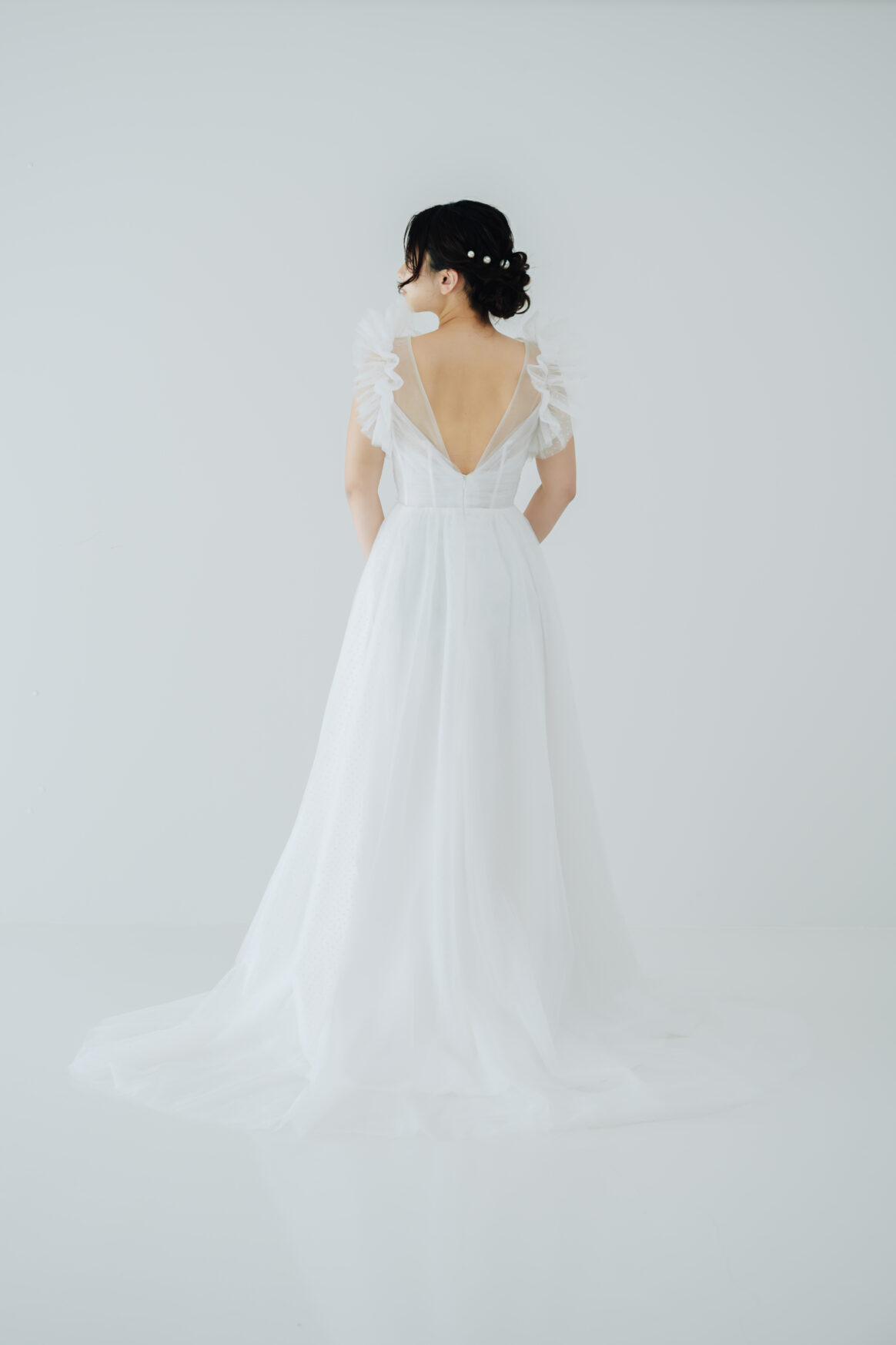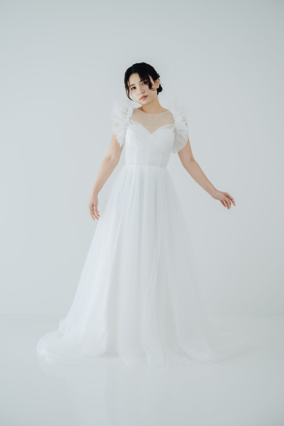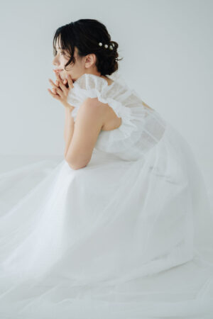 さりげないドット柄チュールを重ね、クラシカルな印象にモダンな遊び心をプラス。