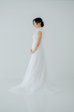 胸元は露出を抑えつつ程よくカバーし、デコルテを上品に見せてくれます。フォトウェディングやガーデン挙式にもおすすめ!