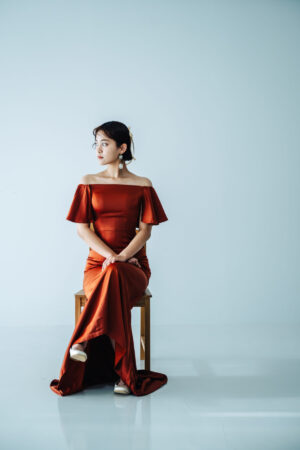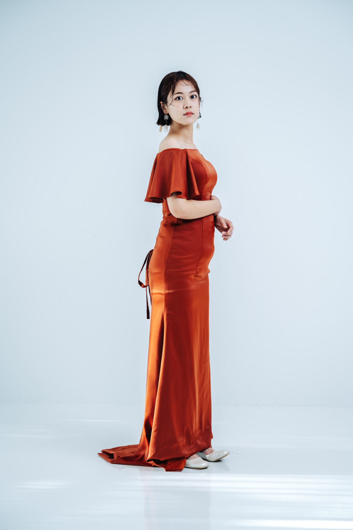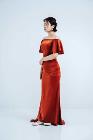 オフショルダーの腕部分は布でカバーされたデザインです。