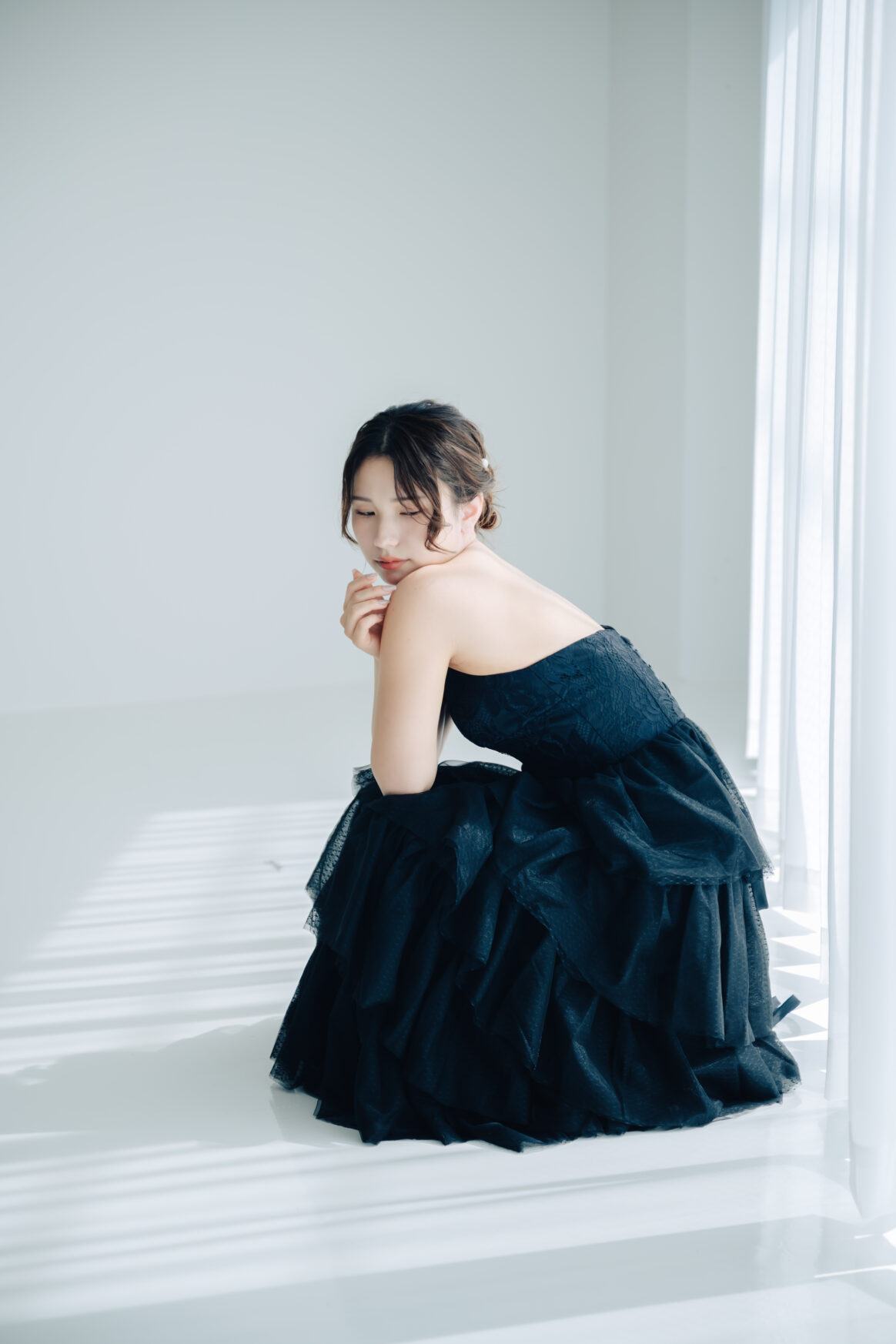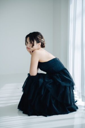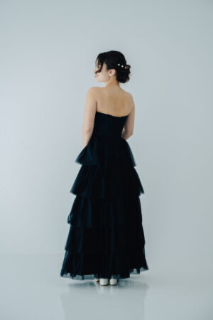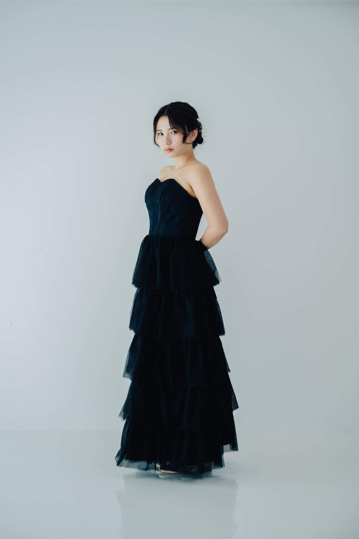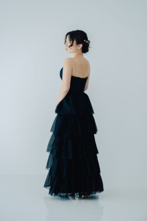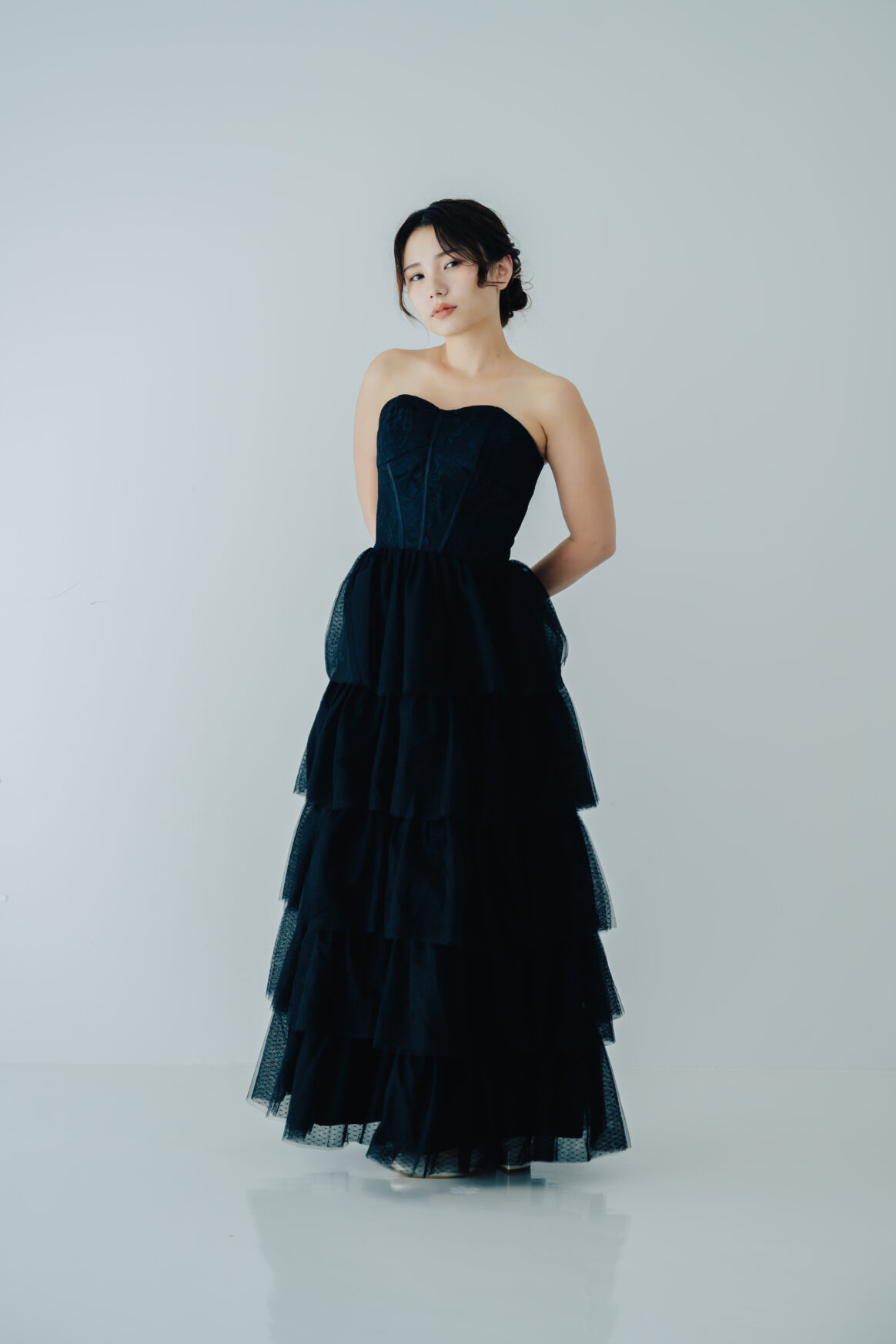 レースのビスチェが美しいブラックドレス。スレンダータイプでありながら、ティアードでボリュームのある”個性派ドレス”!