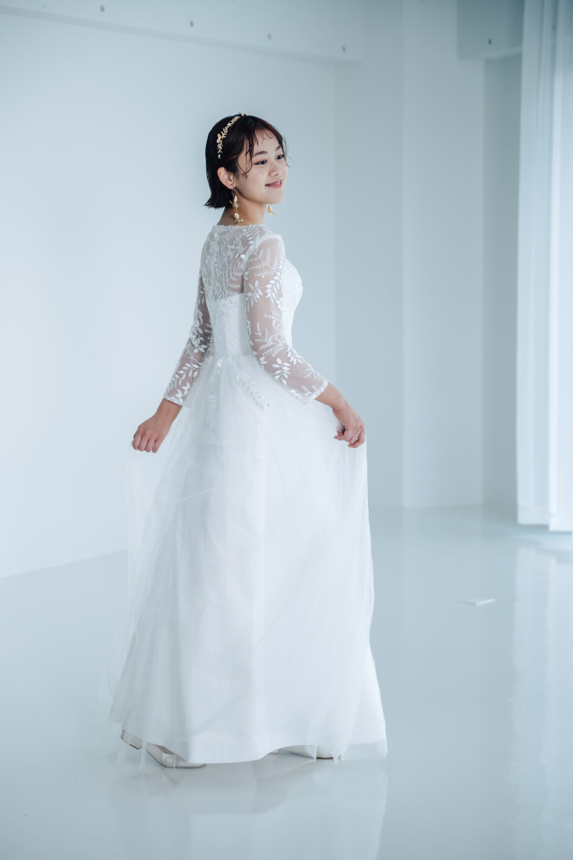 リーフ柄の刺繍がウエスト下まで広がる、ナチュラルな印象のドレスです。二の腕カバーで安心スタイルのウェディングドレス!前撮りやフォトウェディングにおすすめ!