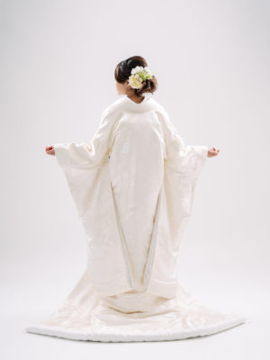 生成りの白無垢で、光沢のある生地は高級感がでて、鶴・藤・菊・御所車・鳳凰と豪華な刺繡が存在感を引き立てます。