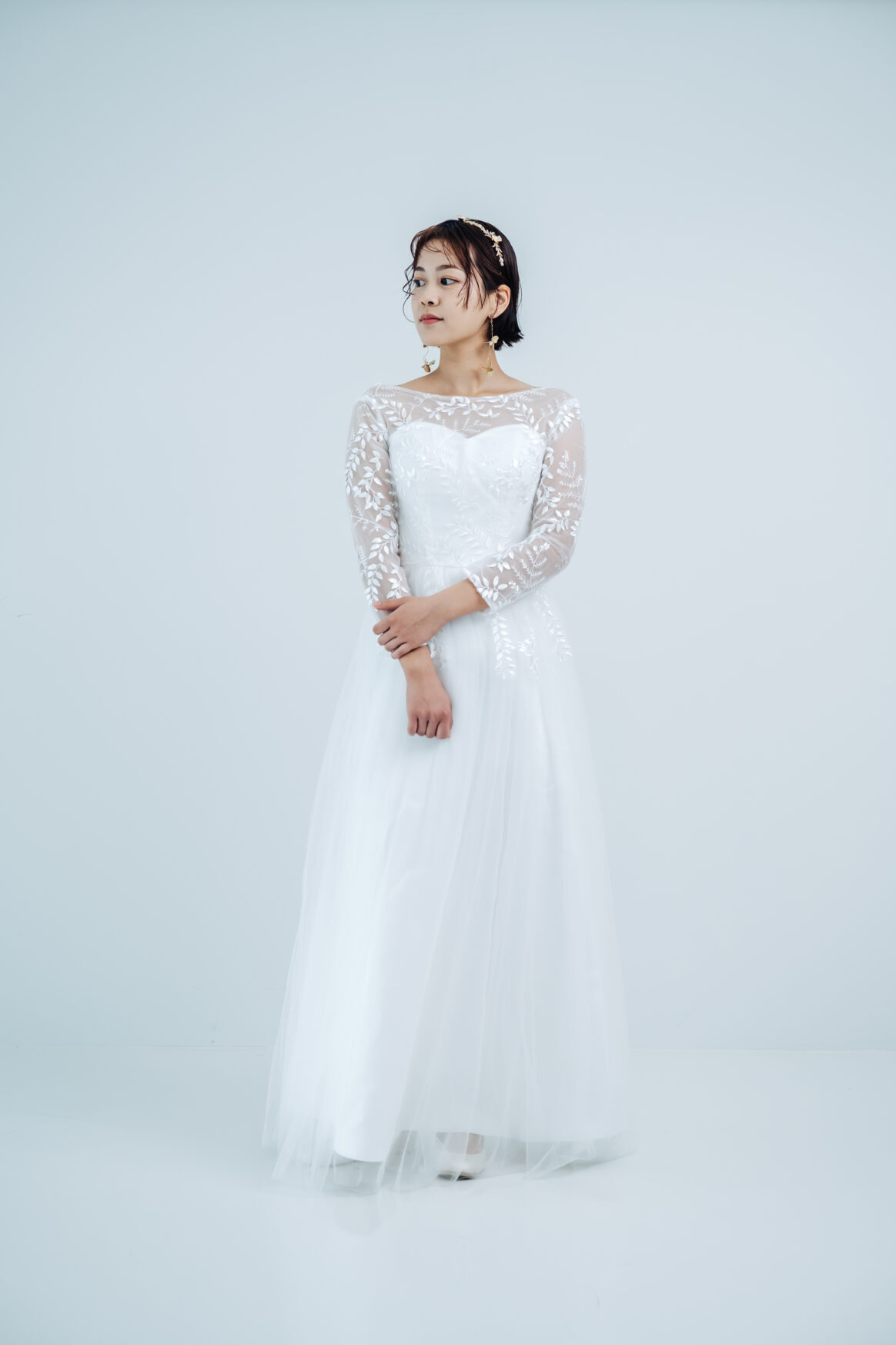 リーフ柄の刺繍がウエスト下まで広がる、ナチュラルな印象のドレスです。