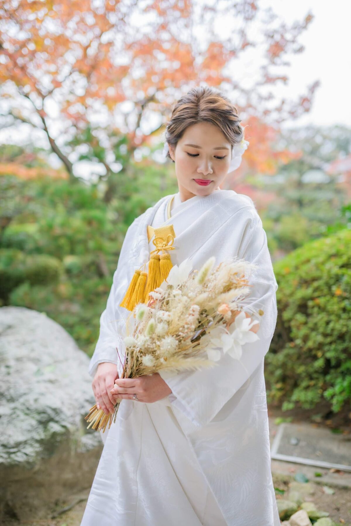 和 × ドライフラワー❀ヘアスタイルは編み込みを少し入れて、タイトにまとめました。大き目の胡蝶蘭を合わせる事ですっきりしつつも、インパクトのある印象となります。またドライフラワーのブーケと、ヘッドアクセのかすみ草がマッチしていて白無垢に凄く映えます♪