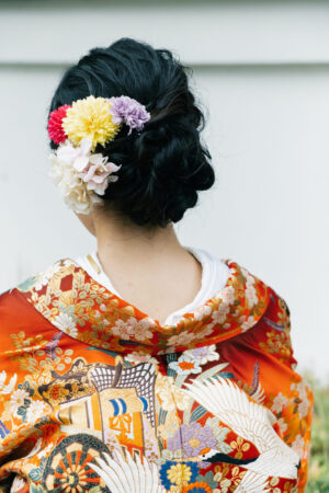 落ち着いた和装の色味に合わせて、ゆるすぎないスタイル。