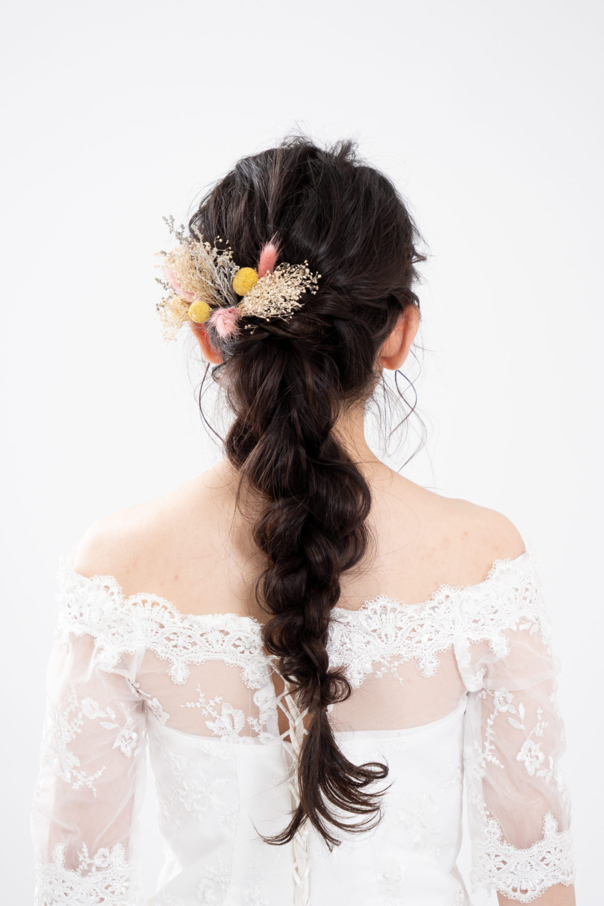 一つに結び、トップをゆるく引き出し、四つ編みをして、バランスよく引き出します。毛先をくるんと軽く巻いて、ドライフラワーで優しくかわいい雰囲気に。。