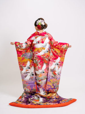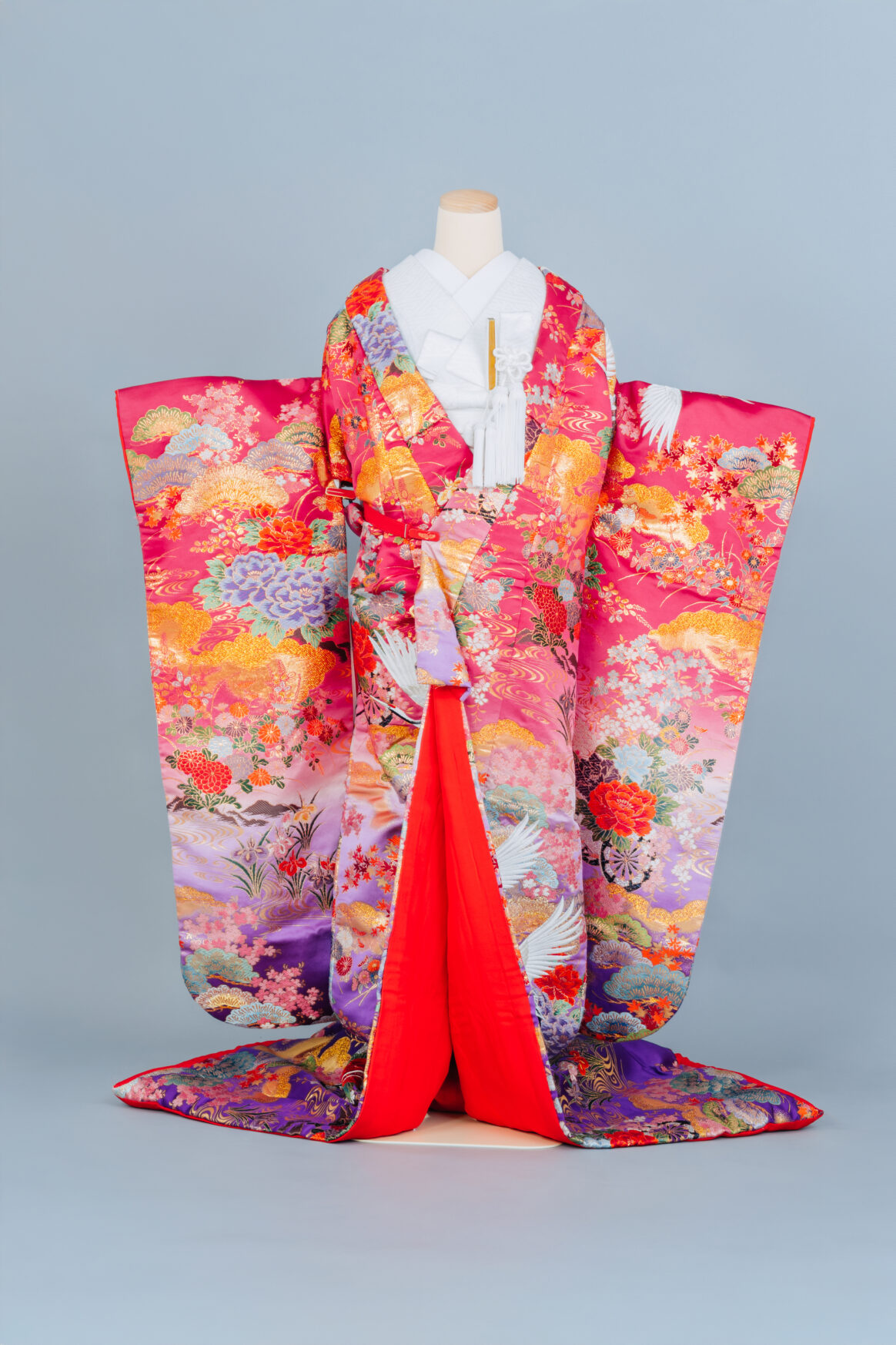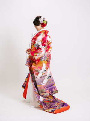 色とりどりの花車とが鶴があしらわれた逸品です。赤・ピンク・紫色のグラデーションがかわいらしさも演出し、披露宴の照明・ライトに照らされて、キラキラとゴージャスに輝く柄行きは、きっとゲストの印象に強く残るでしょう。