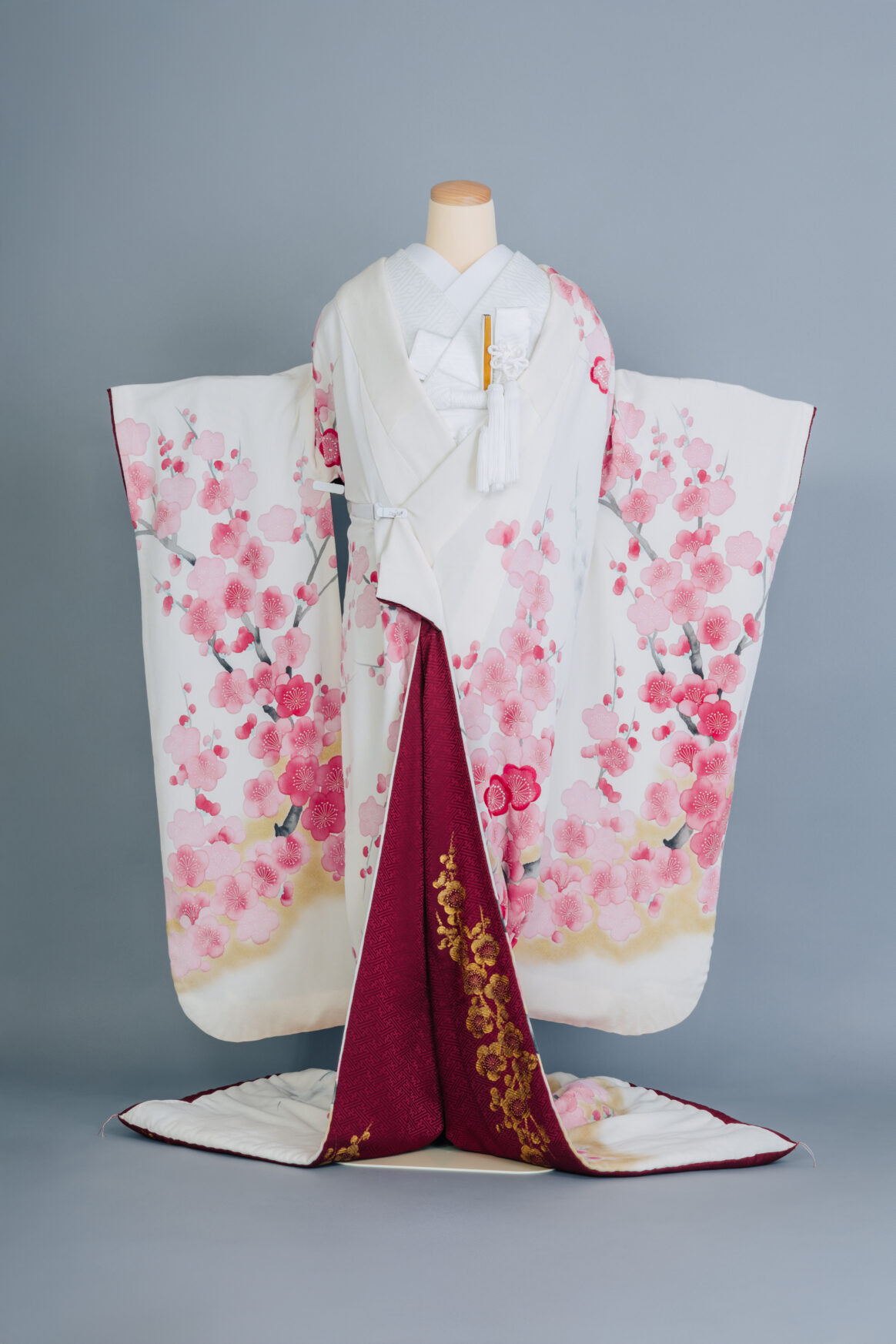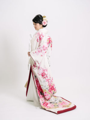 その冬を乗り越え可憐な花を咲かせる梅は、苦難に耐え見事花開く要素がめでたく、慶事の飾り物として用いられてきました。華やかなピンクと白のグラデーションが晴れの日にふさわしい婚礼衣装です。