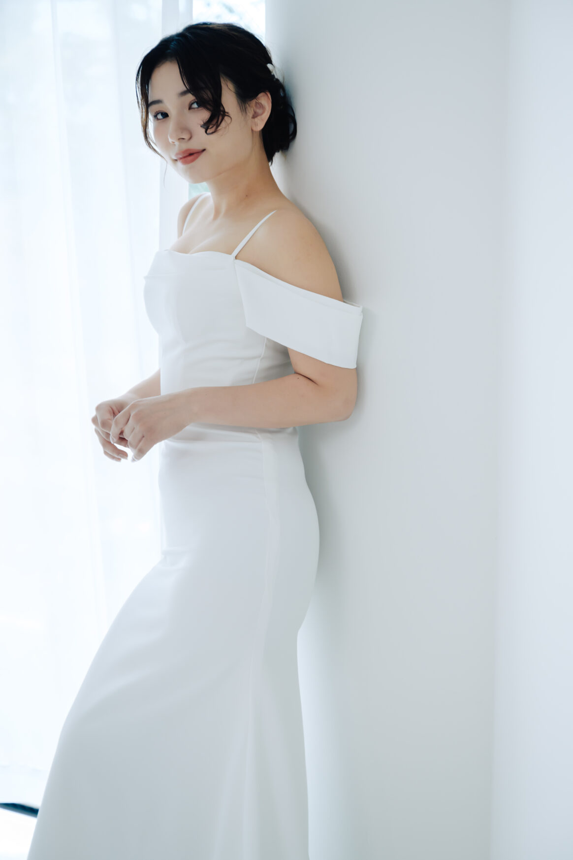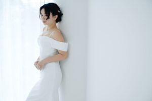 スレンダーラインのシルエットは、身体のラインを美しく見せつつも、上品さを損なわない絶妙なバランス。立体感とやわらかさを演出するデザインで、写真映えも◎