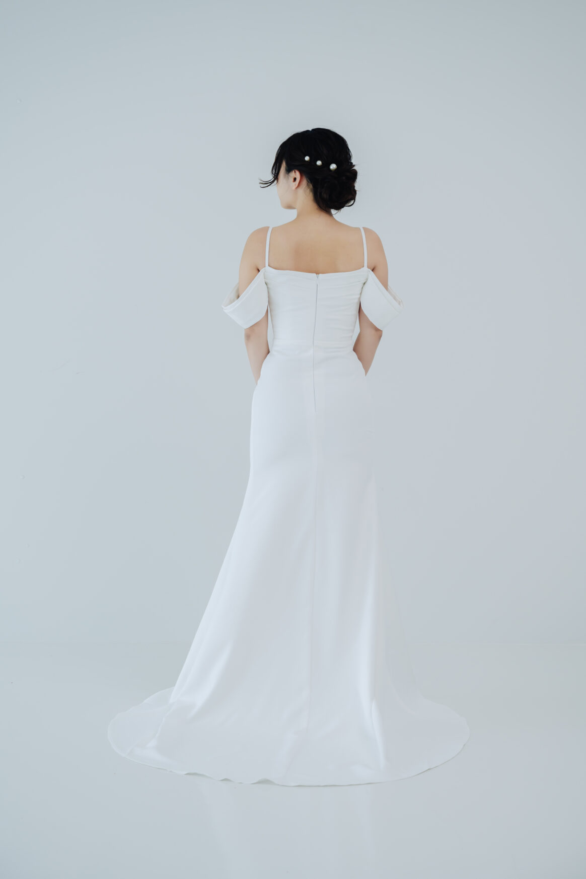スレンダーラインのシルエットは、身体のラインを美しく見せつつも、上品さを損なわない絶妙なバランス。立体感とやわらかさを演出するデザインで、写真映えも◎