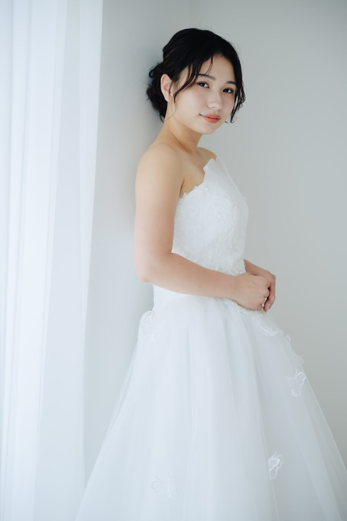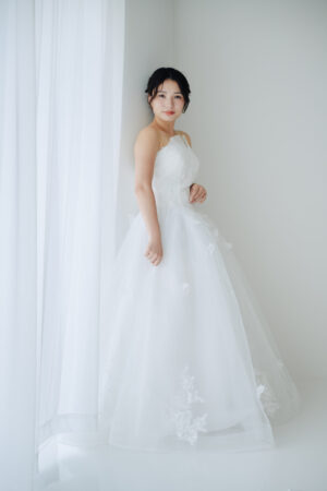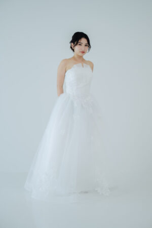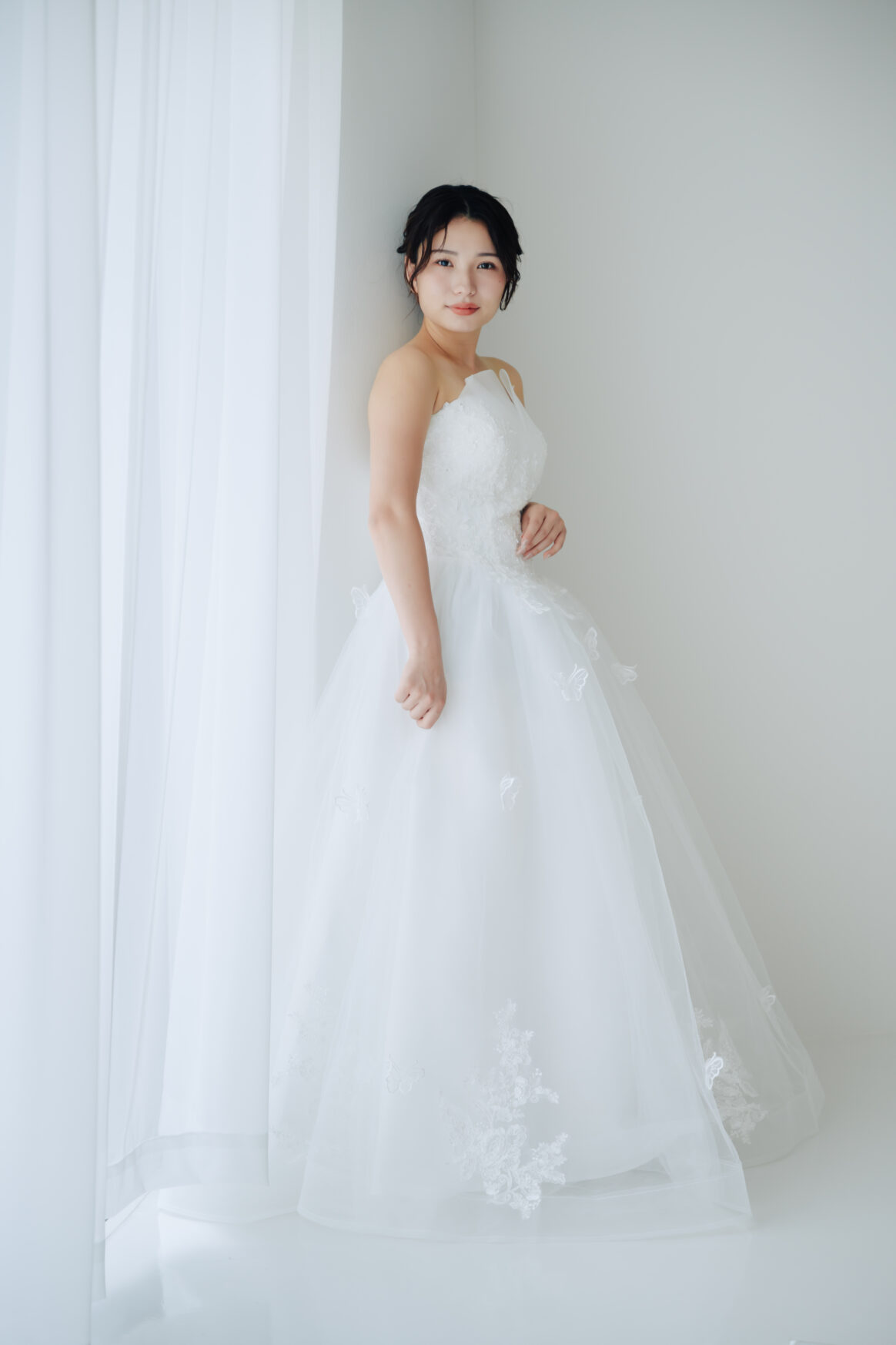 蝶々のモチーフがついた王道プリンセスラインのウェディングドレス。裾はホースヘアで仕上げ波打つトレーンがチャペルに似合います。