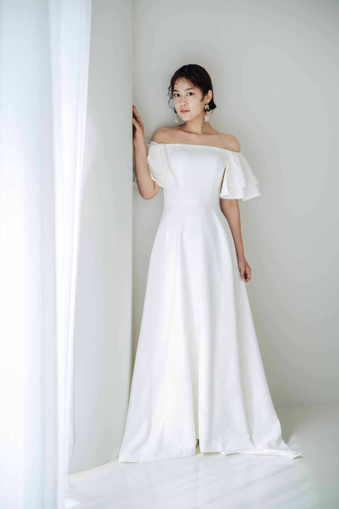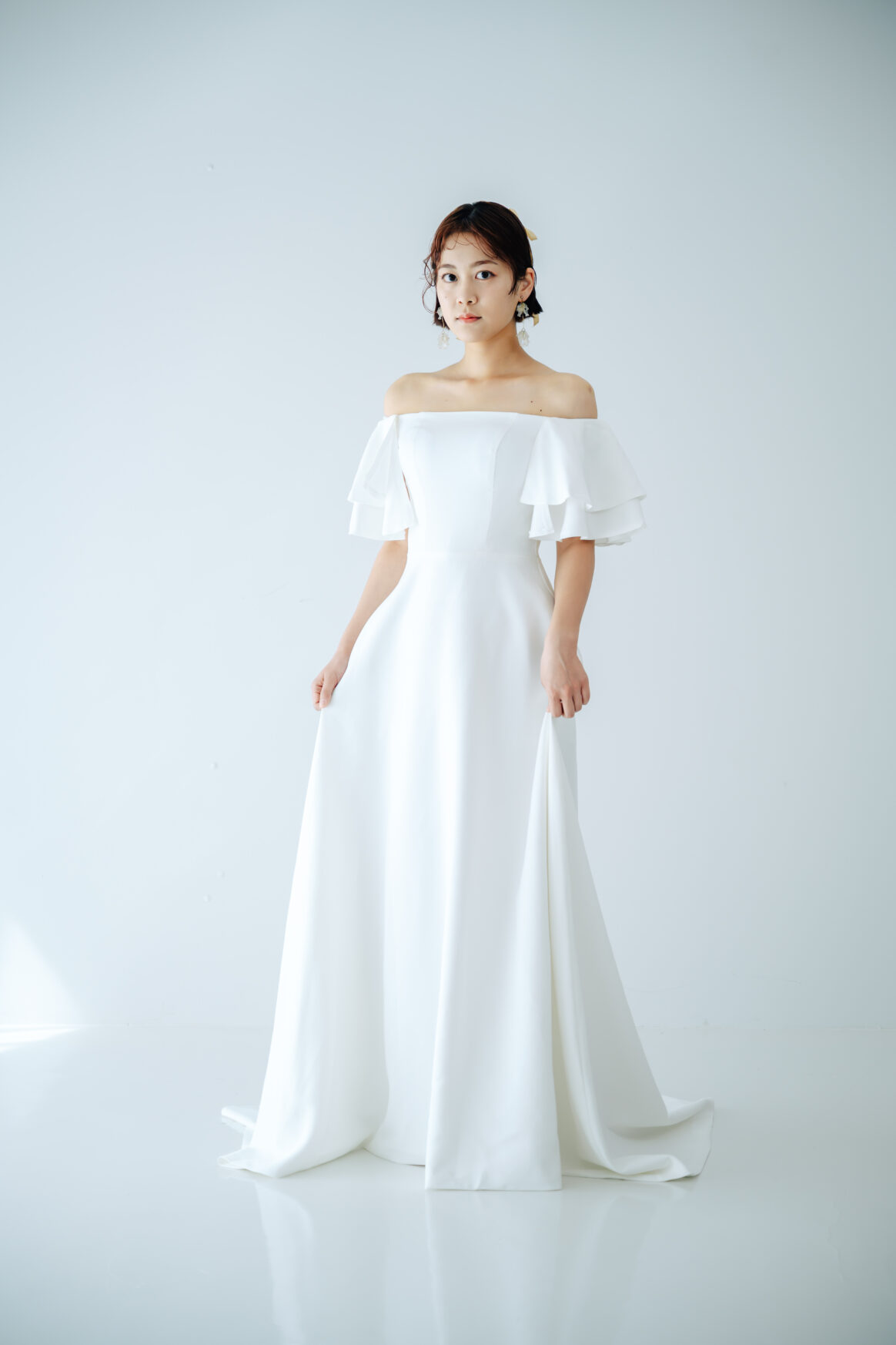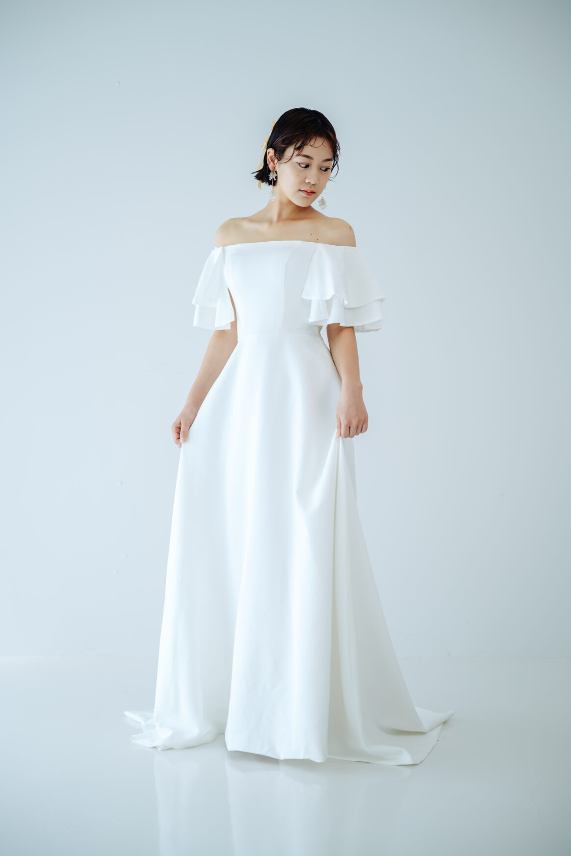 段々になったティアードタイプのオフショルダーが可愛く、後ろにもくるみボタンをあしらったディティールこだわりドレスです。