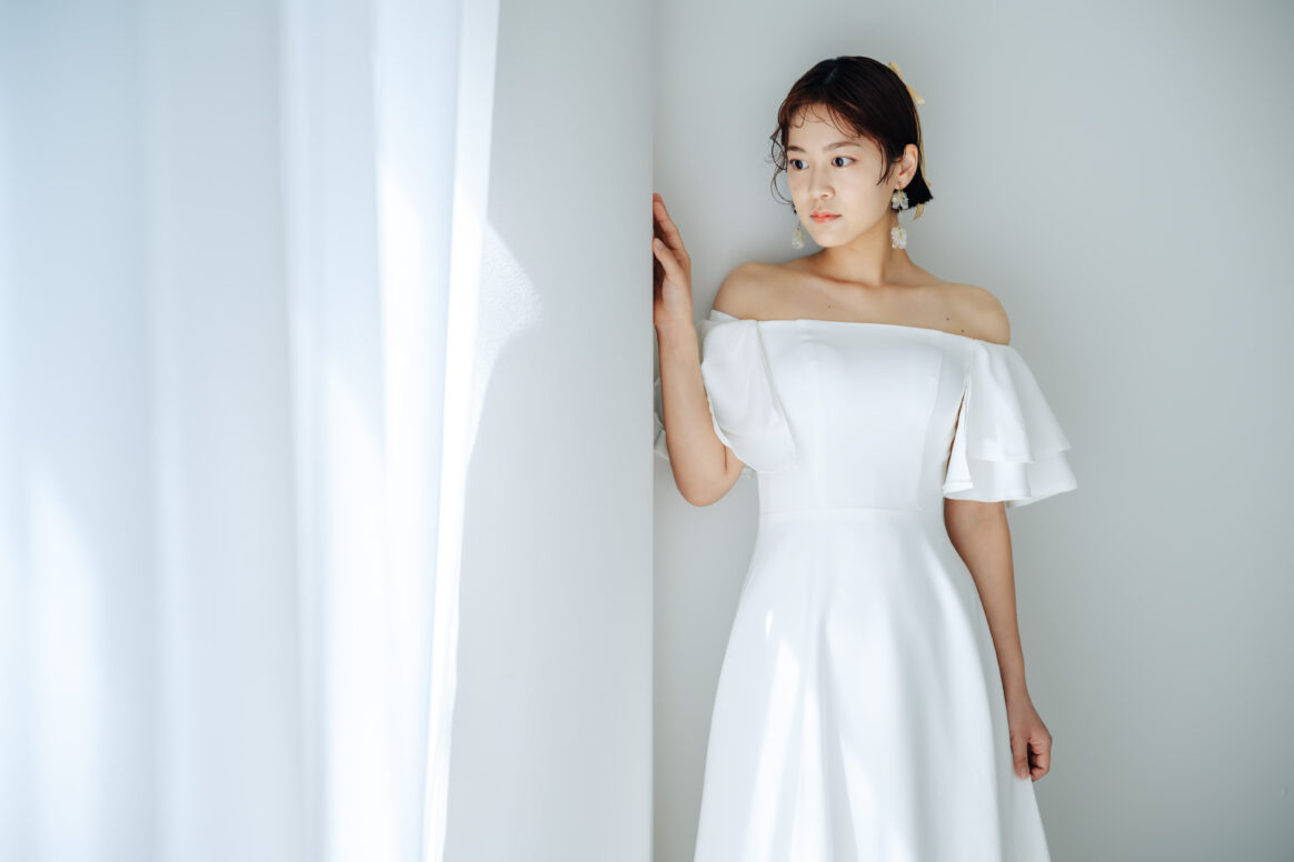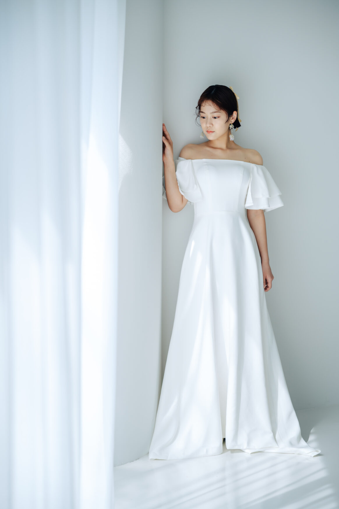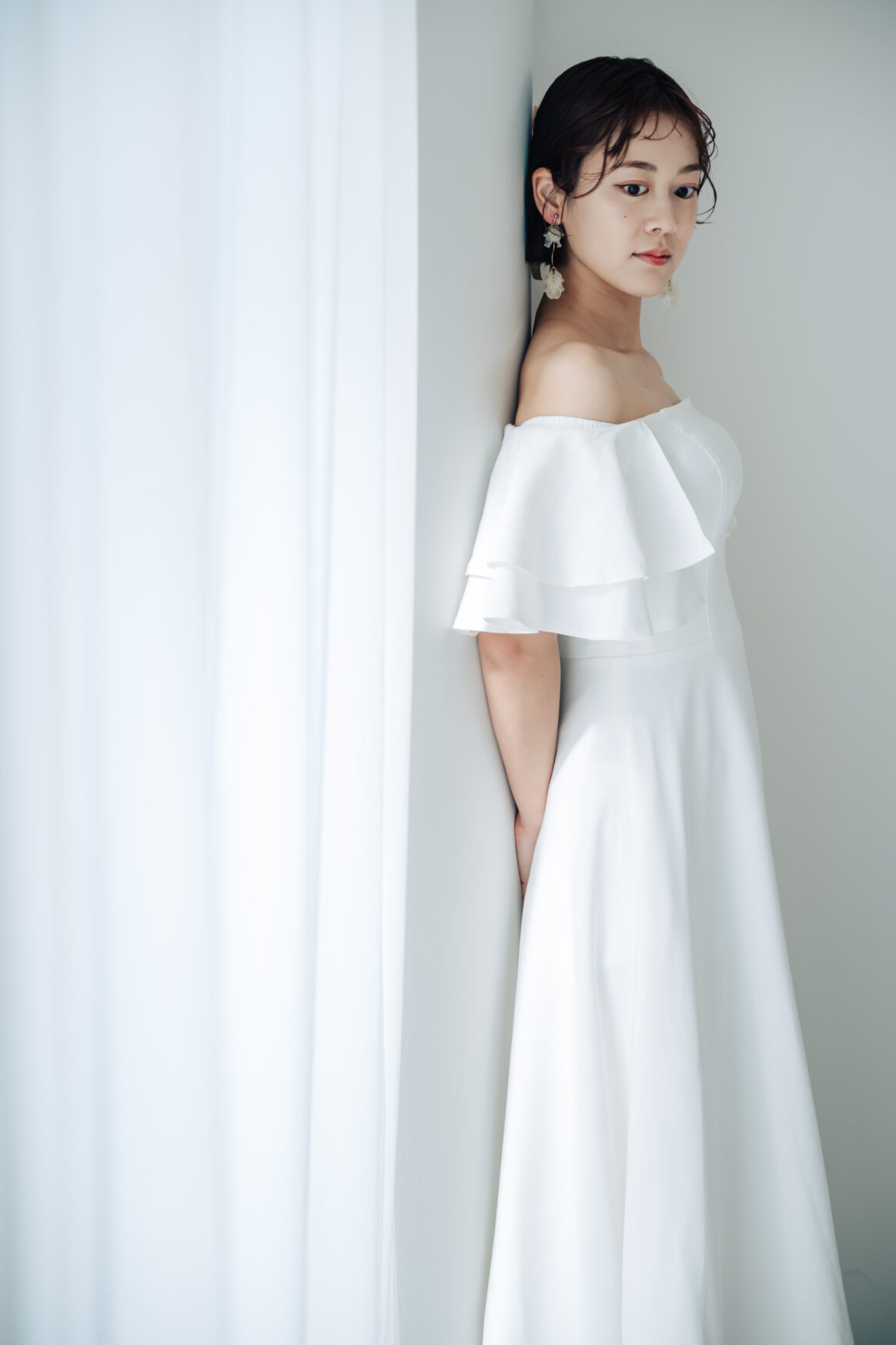 段々になったティアードタイプのオフショルダーが可愛く、後ろにもくるみボタンをあしらったディティールこだわりドレスです。
