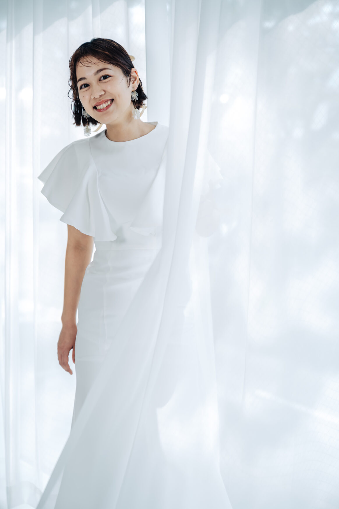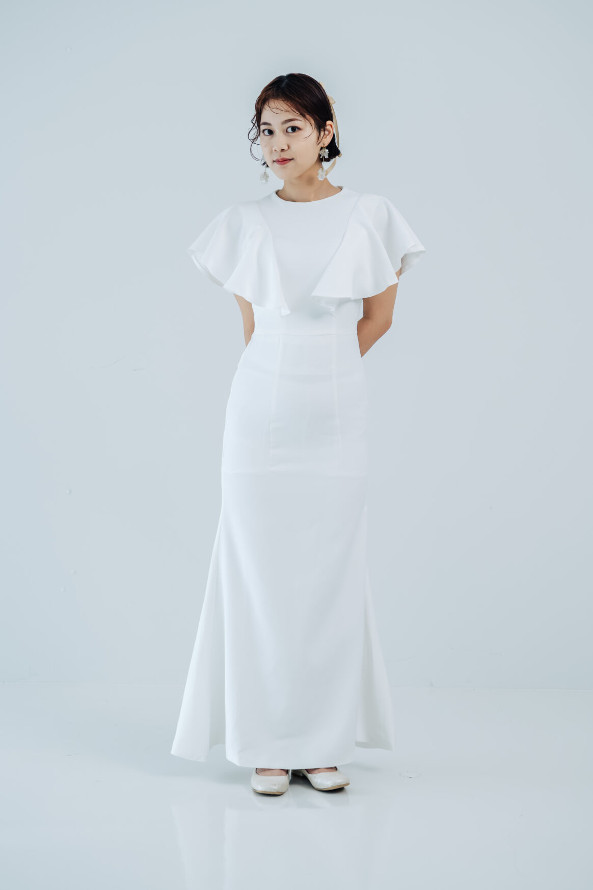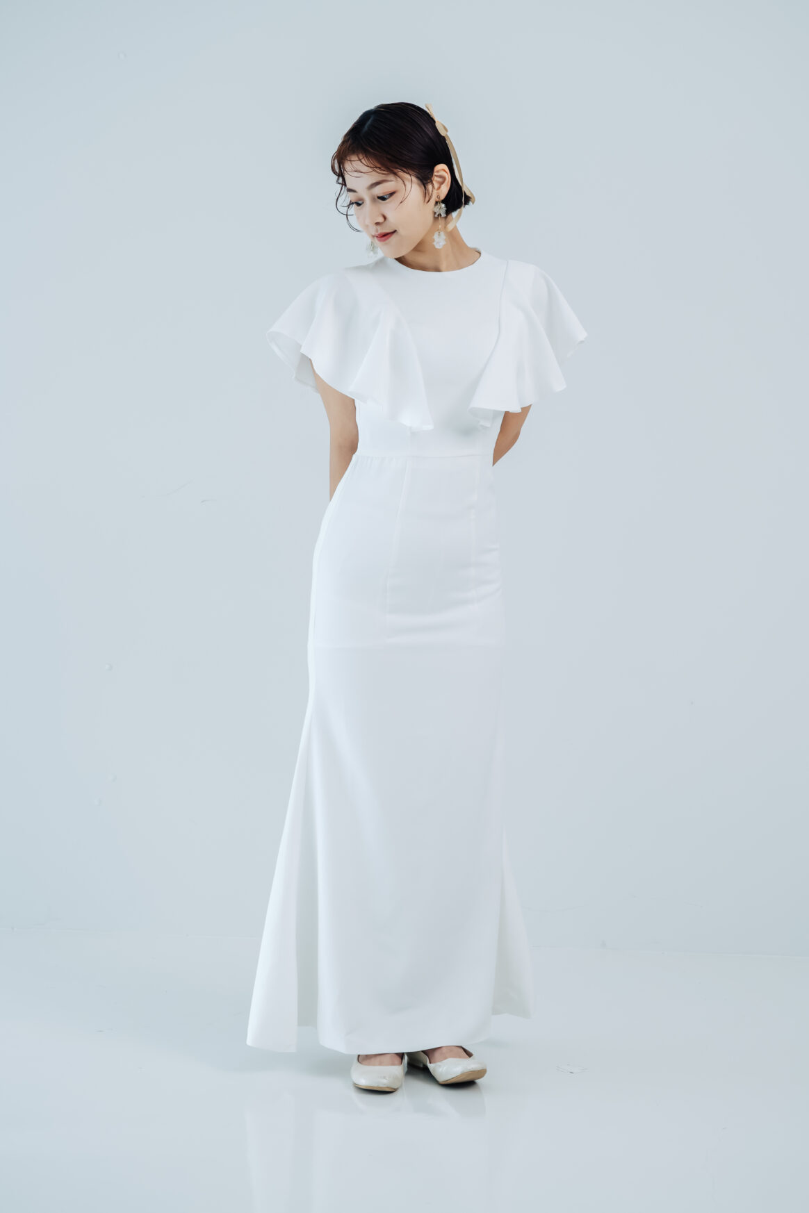 フレアスリーブとマーメイドラインが上品なスタイルを演出してくます。