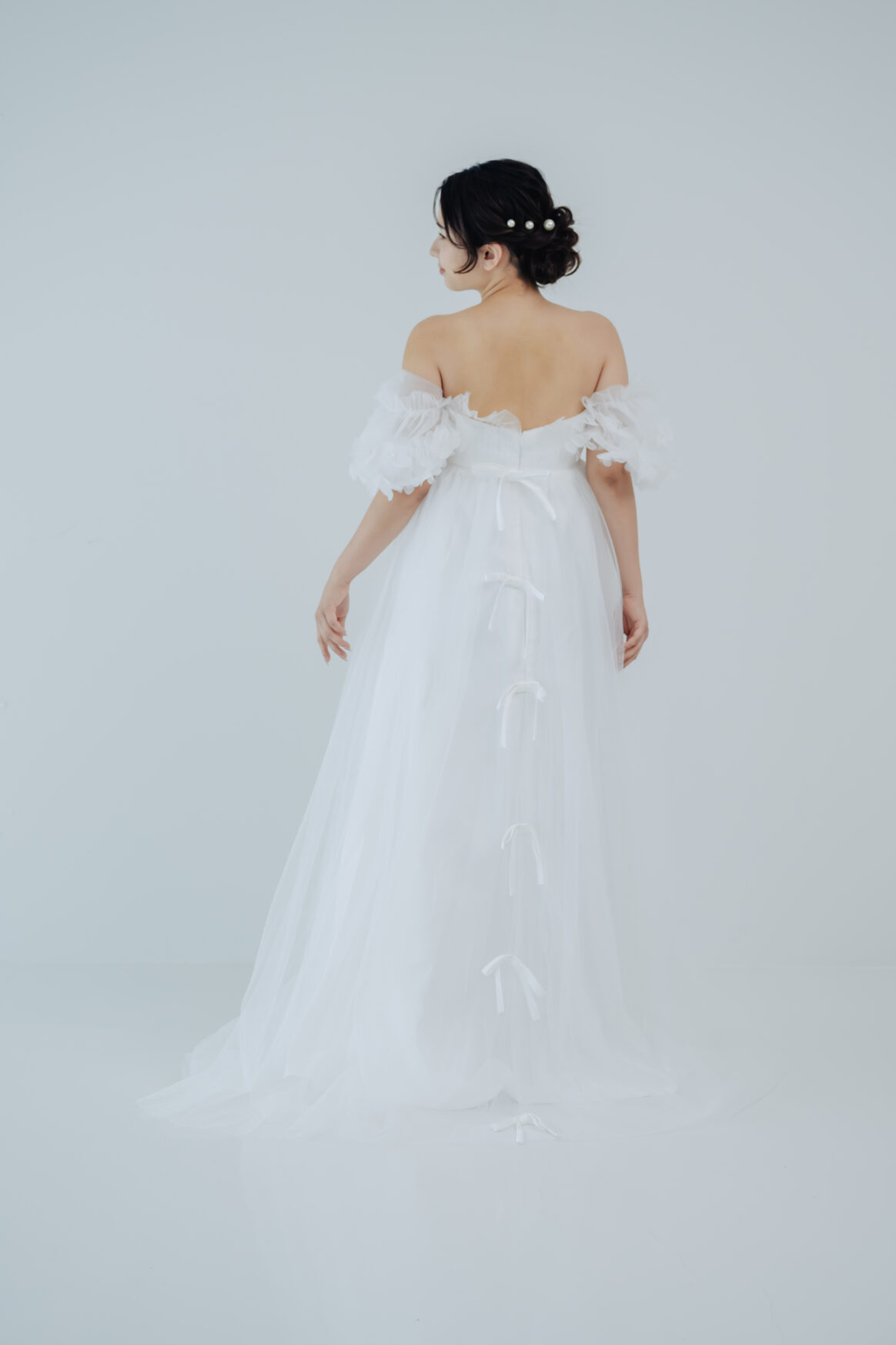 バックスタイルには縦に並んだリボンがアクセントとなり、360度どこから見ても華やかな印象に。