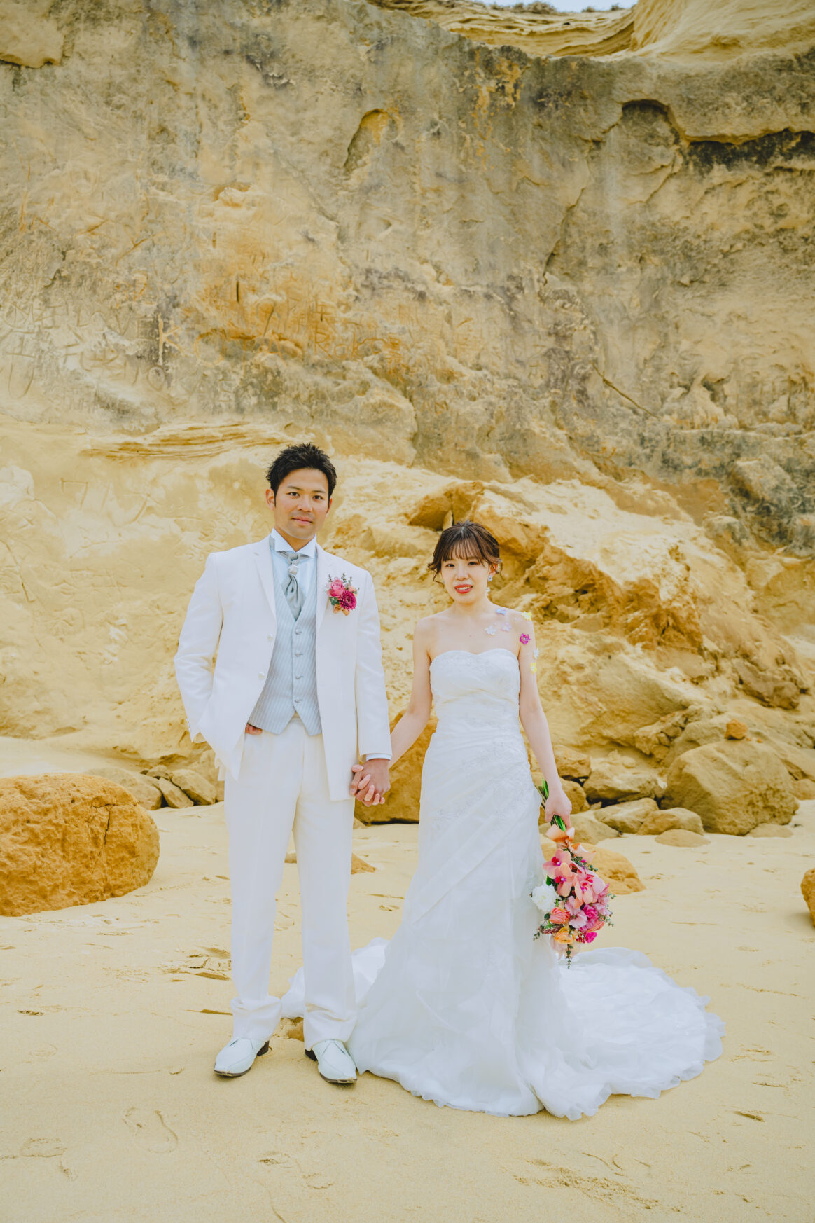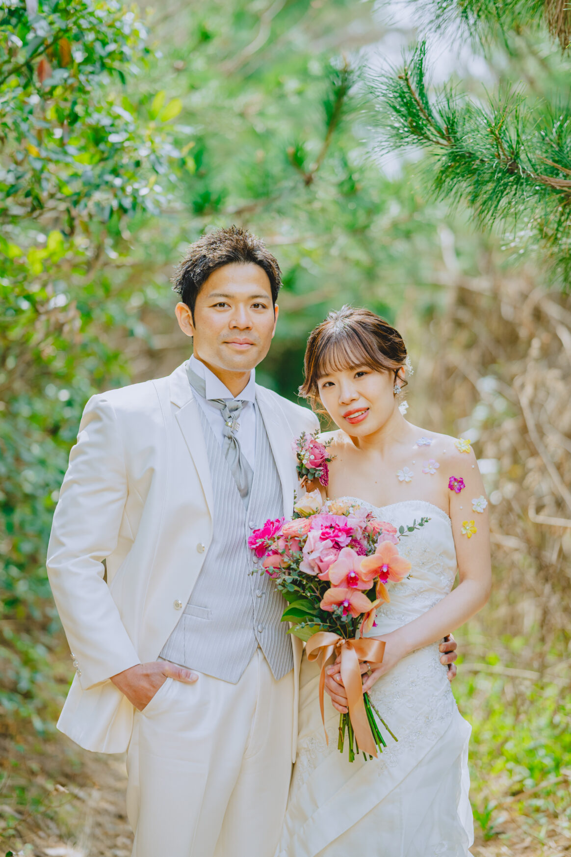シルバーのベストとタイを合わせており、統一感がありつつも華やかな印象を与えます。